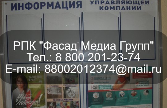 РПК «Фасад Медиа Групп» изготовила и разместила рекламу на инфодосках. Рекламой охвачено 5000 инфодосок по всему городу и более 200 рекламных стендов возле подъездов