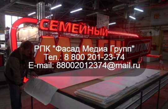 РПК «Фасад Медиа Групп» занимается изготовлением различных рекламных конструкций. Самыми популярными и востребованными являются рекламные вывески. Многие рекламодатели заказывают изготовление световых вывесок для собственных магазинов, салонов и офисов. Мы помогаем нашим клиентам быть заметными. Обращайтесь, будем рады сотрудничеству