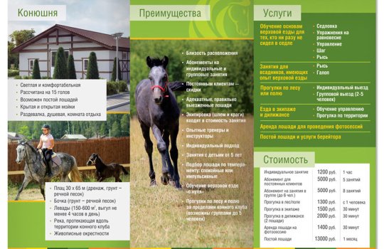 Реклама в конных клубах отличается тем, что рекламные материалы располагаются на уровне глаз потенциального клиента или покупателя. Удачное расположение рекламы приводит к тому, что листовки, буклеты и другие форматы рекламы в конных клубах хорошо видны и обеспечивают 100% читаемость со стороны посетителей.